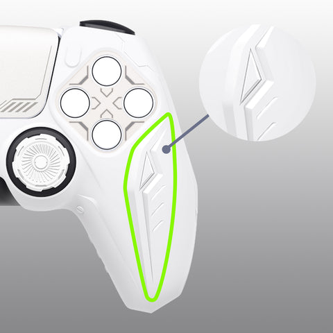 2. The silicone skin features futuristic mech-like textures stacking on both the inner and outer sides of the grips, spliced angular raised lines and grooves, a vintage rivet-like texture below the thumbsticks, and angular raised ridges under the triggers.