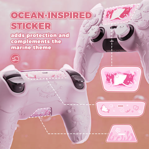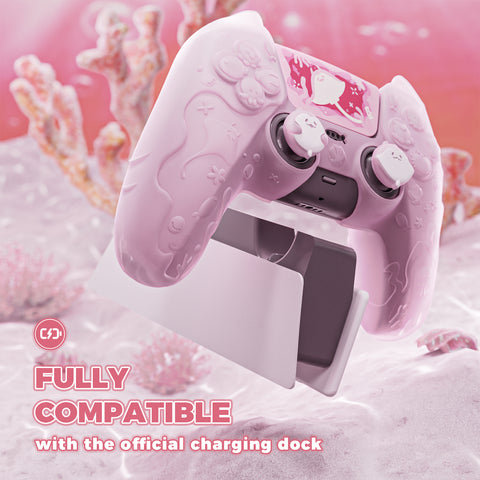 PlayVital for PS5 Controller Cover Skin - Cute Ocean Whisper Series Semi-Clear Silicone Case for PS5 Controller with Thumb Grip & Sticker, Charging Station Compatible, Full Protection - Peach Pink - HYKPFP002