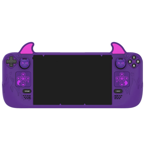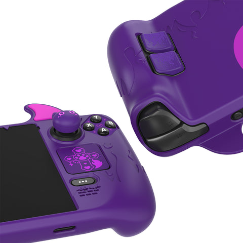 3. The case features a distinctive devil-themed design. It is adorned with devilish elements, including demon ears on top, devilish outlines around the screen, raised flame patterns along the left and right grips, and lovely demon cat air-cushioned joystick caps, along with matching decals for trackpad, D-pad button, and ABXY area. In addition, a pair of back button enhancement covers helps reduce finger fatigue.